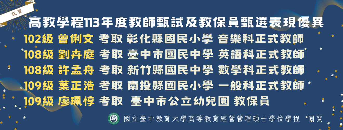 108級學生劉卉庭同學於113年教師甄試中表現優異,考取臺中市國民中學英語科正式教師。